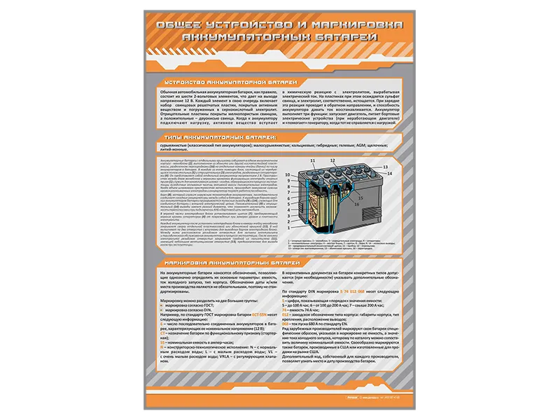 Стенд представляет собой информационную панель, на которой размещены сведения об общем устройстве и маркировке аккумуляторных батарей транспортных средств.
