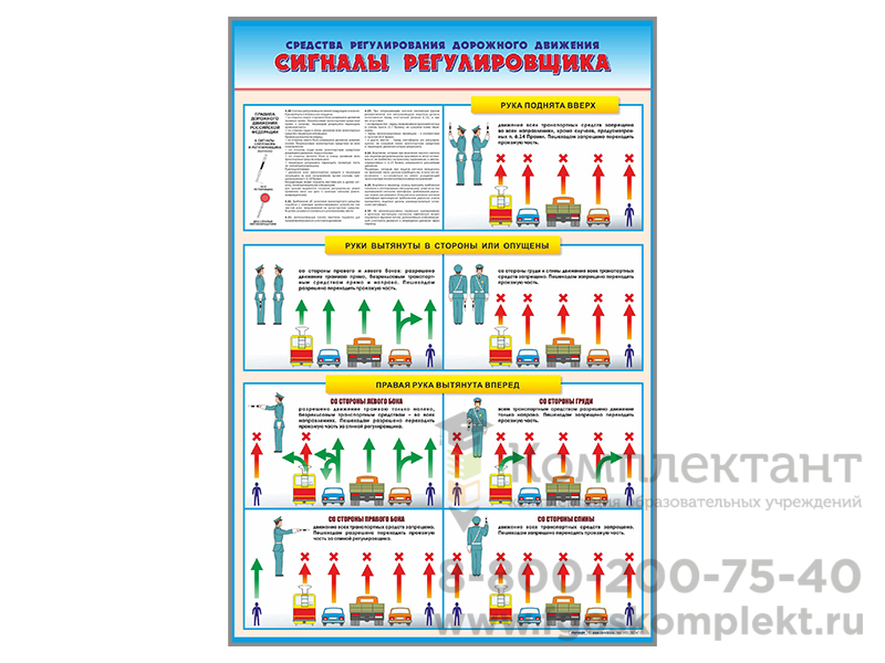 Стенд предназначен для наглядного отображения информации о сигналах регулировщика согласно Правилам дорожного движения РФ, а также для формирования у учащихся автошкол знаний о средствах организации дорожного движения.