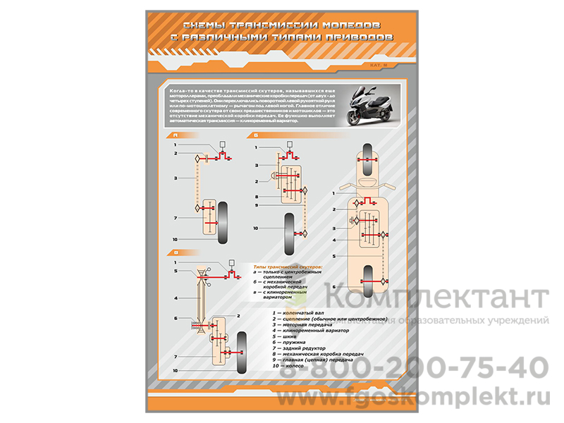 Стендс отображением информациио схемах трансмиссии мопедов с различными типами приводов.