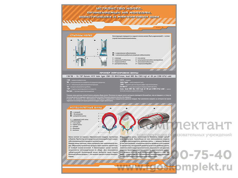 Стенд представляет собой информационную панель, на которой размещены сведения об устройстве колес, применяемых на мопедах, конструкции и маркировки шин.